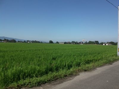 緑いっぱいの田んぼ道を通りかかると、ヘリコプターが、低く飛んでいました。