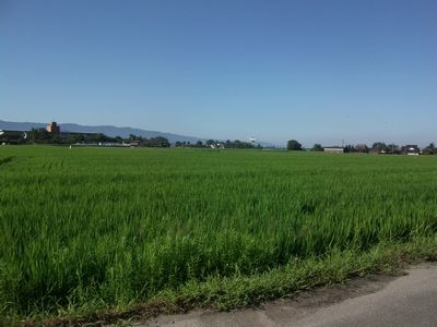 緑いっぱいの田んぼ道を通りかかると、ヘリコプターが、低く飛んでいました。