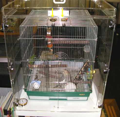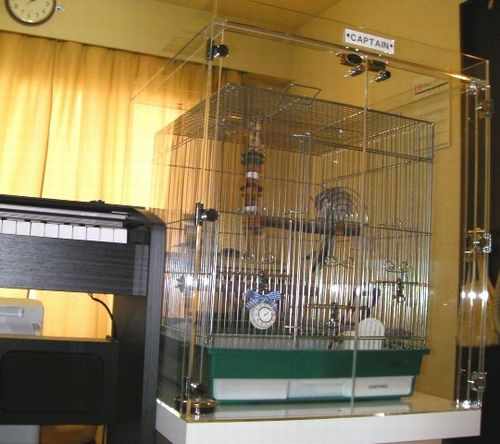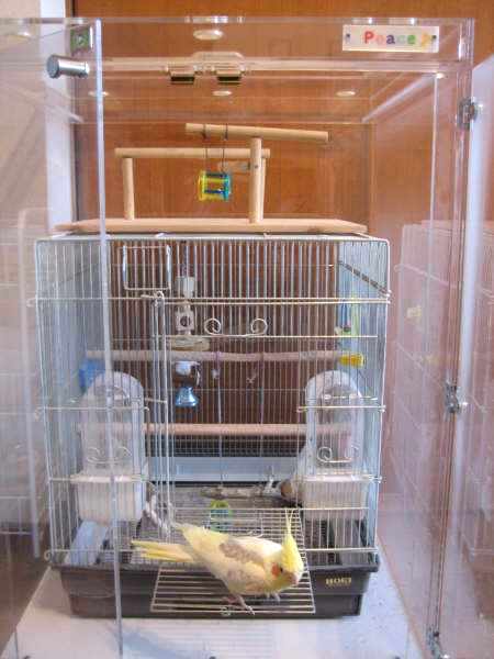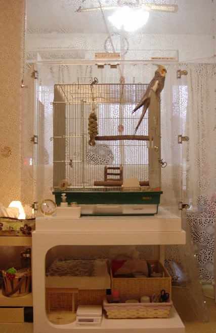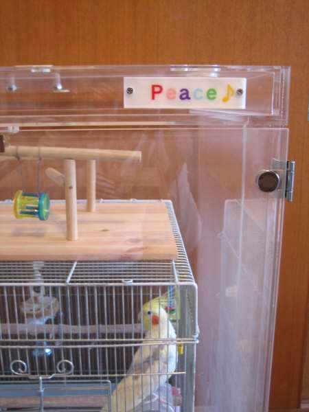 鳥かご鑑賞ケース(アクリル製の鳥かごケージカバー)ご購入の お客様の使用例をご紹介しています。 p43,埼玉県、CAPTAINちゃんとTSUBAKURO ちゃん CAPTAINちゃん ご購入、導入後の様子 上の写真は放鳥時でケース、ケージの扉を全開にすると、 ワクワクしている?CAPTAIN君。 その後、飛んだり、ケージの上で遊んだり、ケースの縁を歩き回ったり、 自由にしてるそうです。 呼び鳴きが激しい時以外は、フタは外されているそうです。 初めての冬も日当たりがよく温かいせいか、ケース内は、18~20度を保て、 ペットヒーターも不要だったそうです。 保温性もよく、よい買い物をしたと近況報告頂きました。 尚、ケースの下の台はサイズなど、ケースと合わせてご購入との事で 見た目もよく、ケースを支える安定感もありそうです。 脂粉でピアノが汚れてしまっていたそうですが、 アクリルケースのおかげで、心配なくなったとのことです。 夜はおやすみカバーを装着。 市販のカバーも、フタがはずせるので簡単にかけられるそうです。 正面扉の、2個のマグネットに 注目! 鳥かご鑑賞ケース(観音開き仕様)では、購入時、この部分の金属はむき出しに なっていましたが、金属ぽい銘板シール(?)を貼られており、 「愛鳥さんと、ご自身のケース」への「ごだわり」が感じられます。 ハッピーケースで、鳥かごのサイズや用途にあったケースを ご注文後、更に届いたケースに手を加え使い勝手の良い、 またはお気に入りのケースに仕上げる という使い方をされている方は多いようです。 もちろん、これも愛鳥さんへの愛情がたくさんだから できることだと思います TSUBAKURO ちゃん 人の姿が見えないように、夜の挿し餌以外は、 カバーで覆ってあります。 ”カバーは手作り”です。 かわいい柄ですね。 上のカバーをめくると・・・TSUBAKUROちゃんが居ます(^.^)